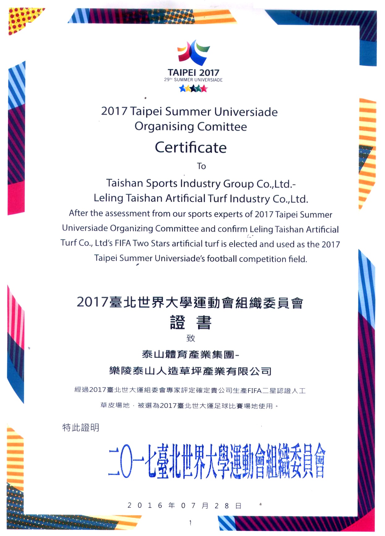 2017台北世界大学运动会组织委员会证书致乐陵星空集团人造草坪产业有限公司